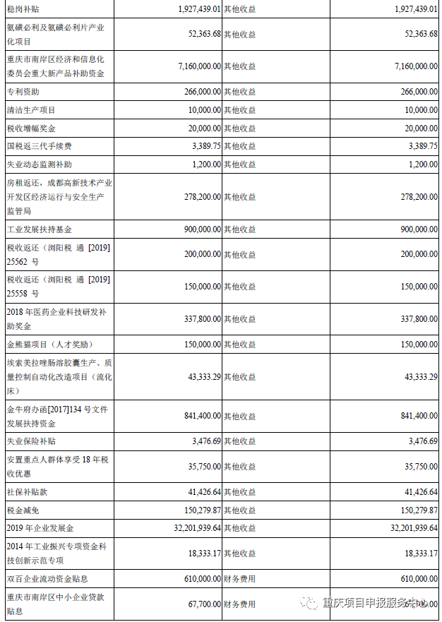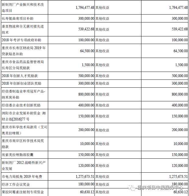 上面几家主要从事汽车及配套产品,再看两家做医药的公司,莱美药业主要做医药研发及生产,2019年全年营业收入18.59亿元,获得财政府5264.34万元,除了常规政府补助项目外,还获得了医药研发补助方面项目,公司最近几年研发埃索美拉唑肠溶胶囊获得不少政府支持。